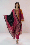 An exclusive digital printed lawn three-piece set embellished with Chunri print, golden lurex embroidery, decorative lace, and braid detailing that exudes elegance and sophistication,