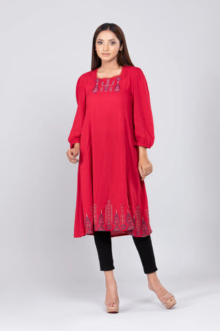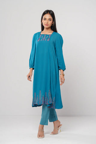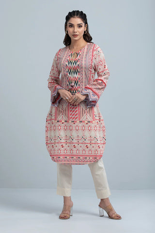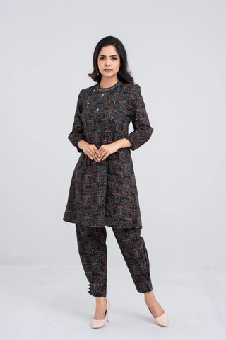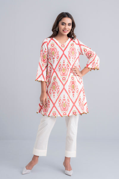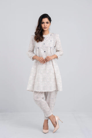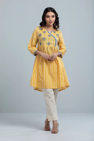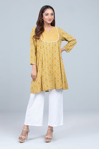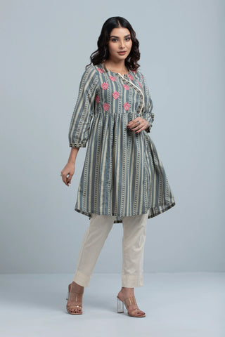 Elevate your style effortlessly with our short-length gathered and Angrakha-style printed kurti. Crafted from luxurious lawn fabric and adorned with delicate lace and embroidery, it seamlessly combines comfort and chic. Embrace understated elegance for any occasion.