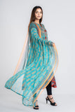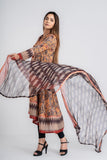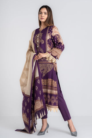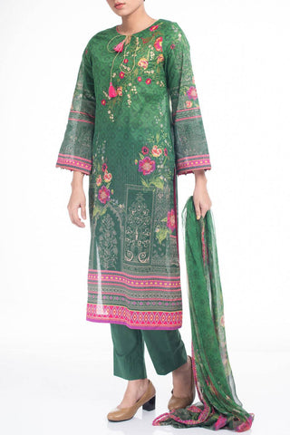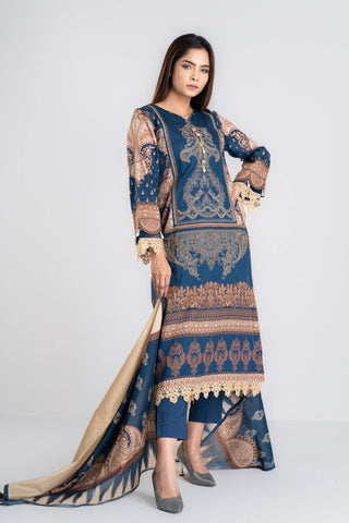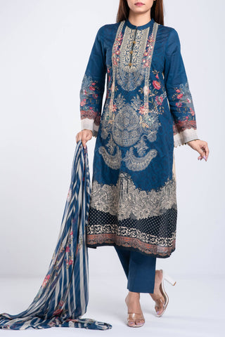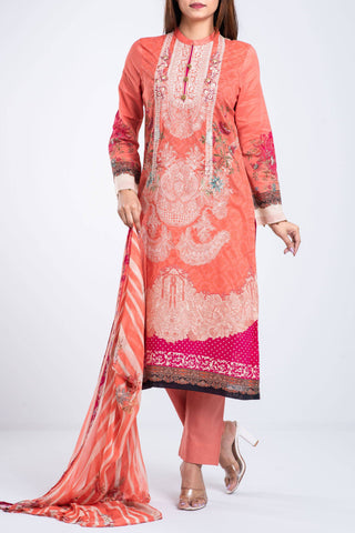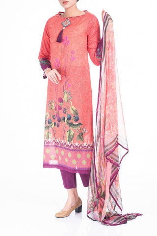 An exclusive digital printed lawn two-piece set embellished with Persian print, Decorative lace, contrast piping and decorative button detailing.