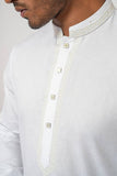 This White Panjabi with a band and around placket embroidery is a popular choice for various programs and events, where its elegance, comfort, and intricate craftsmanship are appreciated and admired.