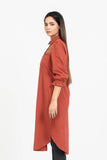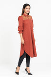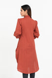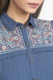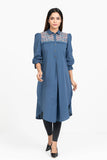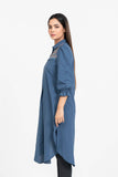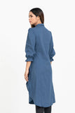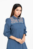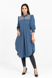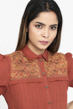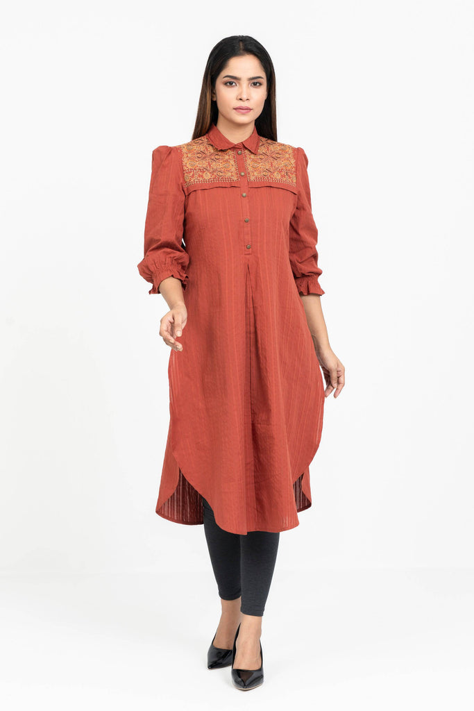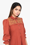 A single piece in cotton jacquard fabric. Embroidered, shirt collar added lace & inverted pleat at front. 3/4 sleeve with smocking.