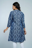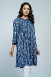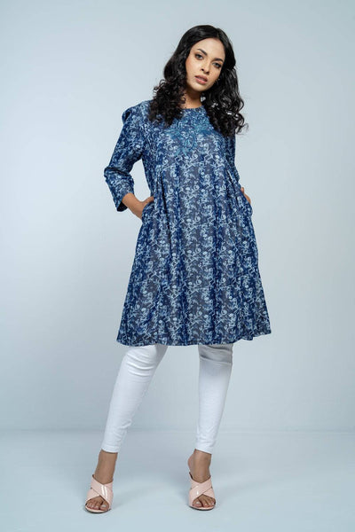 A single piece in denim fabric with different wash. Allover discharge printed added embroidery, frill at the neck.