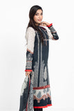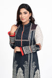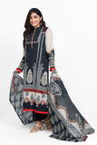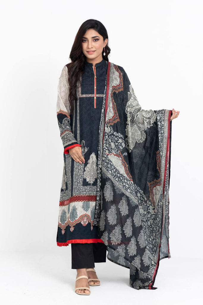 An exclusive digital printed lawn three-piece set embellished with Jamawar print, embroidery, decorative hem with muslin detailing, gold lace, contrast piping, printed patch at front yoke, decorative button and braid detailing that exudes elegance and sophistication,perfect for special occasions or adds luxury to your everyday wardrobe. It's come with a silk dupatta and solid-dyed trouser.