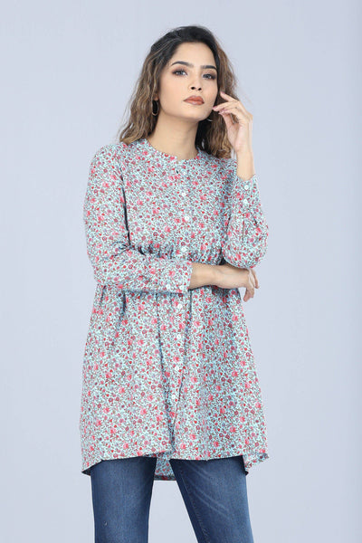 Cotton Fabric, All over Floral print, Ruffle Band collar, Full sleeve buttoned cuff ,Button Placket details women’s Fashion Top.