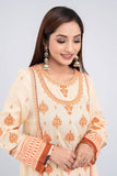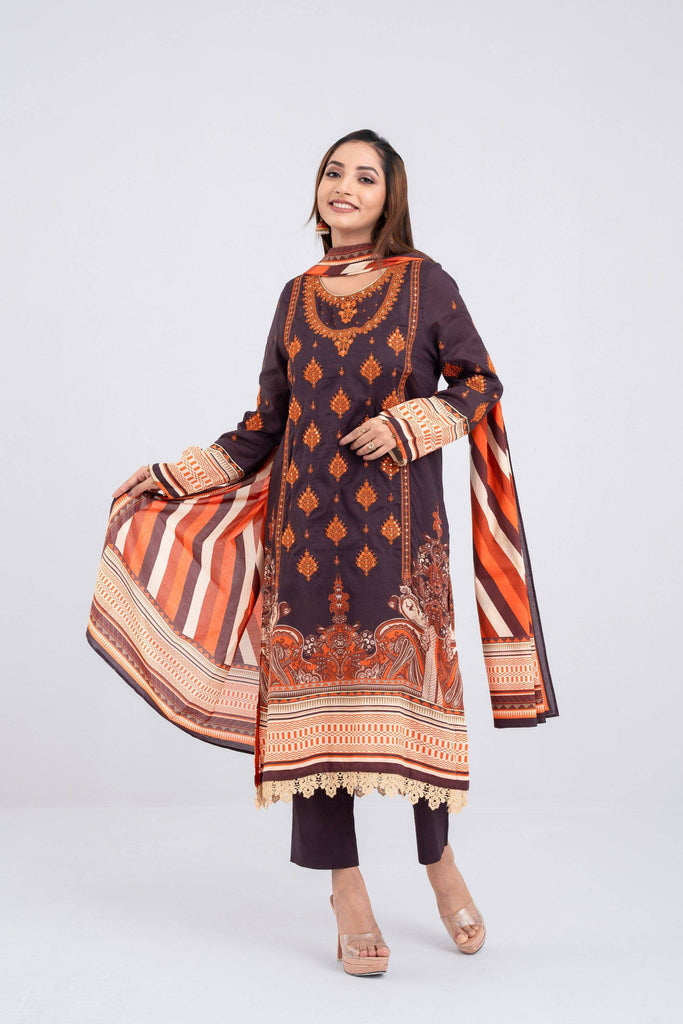 Elevate your elegance with our stunning three-piece ensemble. Crafted from luxurious lawn jacquard fabric, and adorned with full front embroidery, delicate lace, and beads detailing, this ensemble exudes sophistication. Paired with a cotton dupatta and solid-dyed trousers, it's a perfect blend of style and comfort for any occasion.