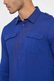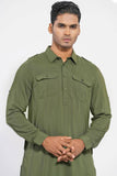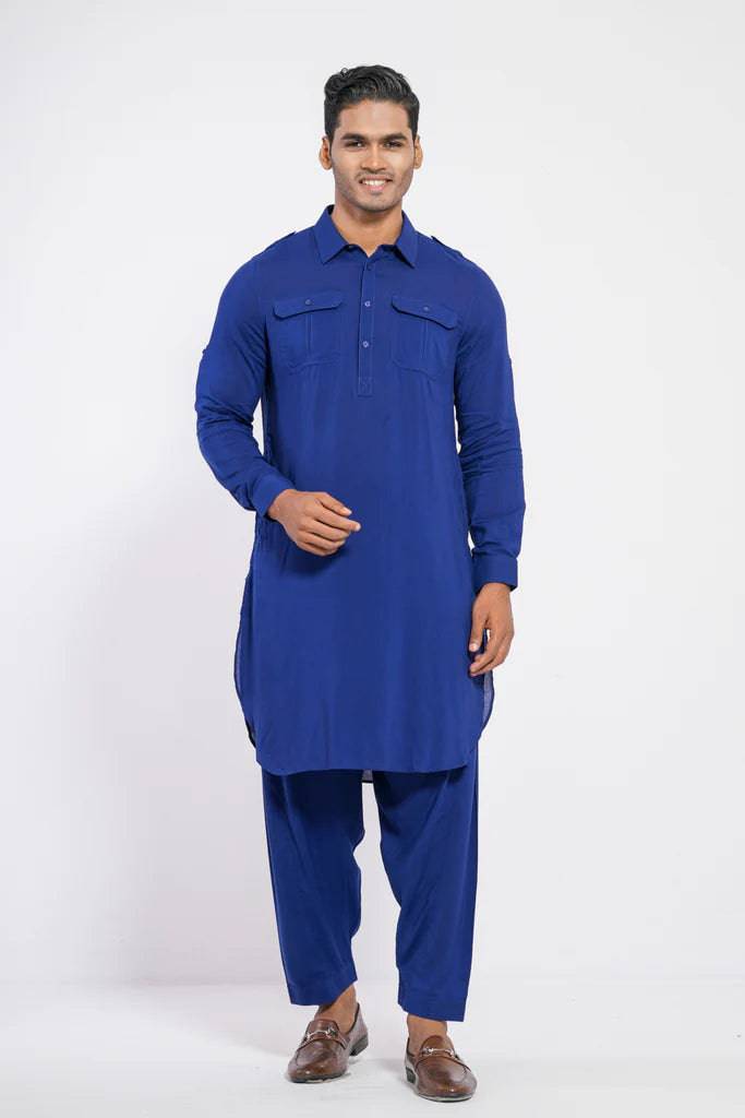 This Kabli set with flap pockets, band collar, and shoulder tab can certainly add a stylish and modern touch to a traditional garment. The combination of these elements can enhance the overall design and aesthetic of the garment, making it more visually appealing and fashionable.