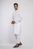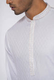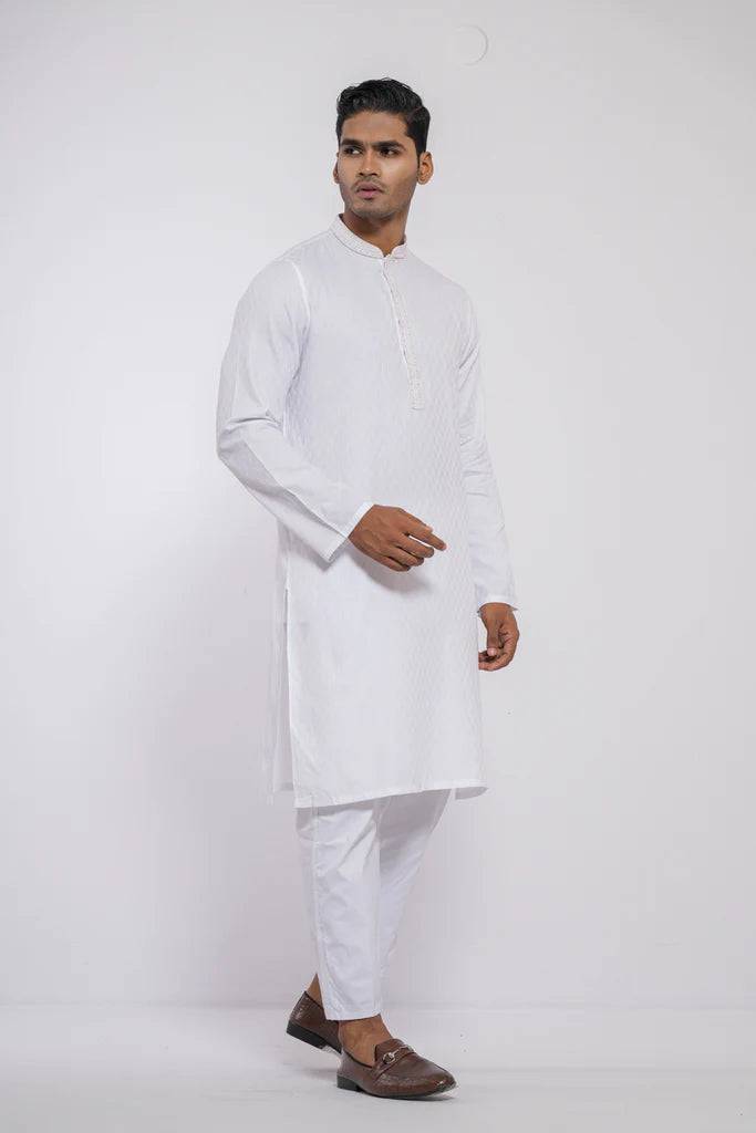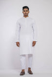 A classic white panjabi with band and placket embroidery. Pair it with white gold for an elegant day occasion.