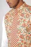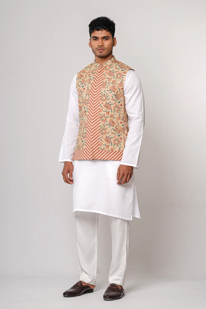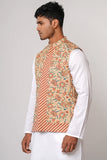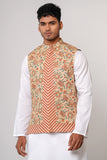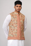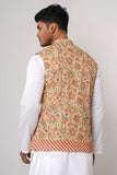 An allover floral printed men's waistcoat with a hidden placket, mandarin band, and inside taffeta lining offers a stylish and sophisticated look. The floral print adds a touch of elegance and charm to the waistcoat, while the hidden placket provides a sleek and seamless appearance.