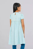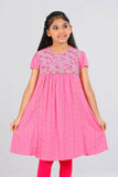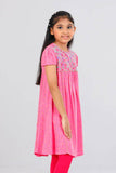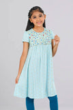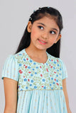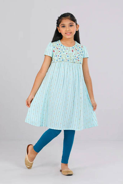 Allover printed on Viscose fabric. Embroidered yoke. Embllishment with cut & sew golden lace.