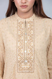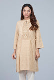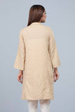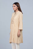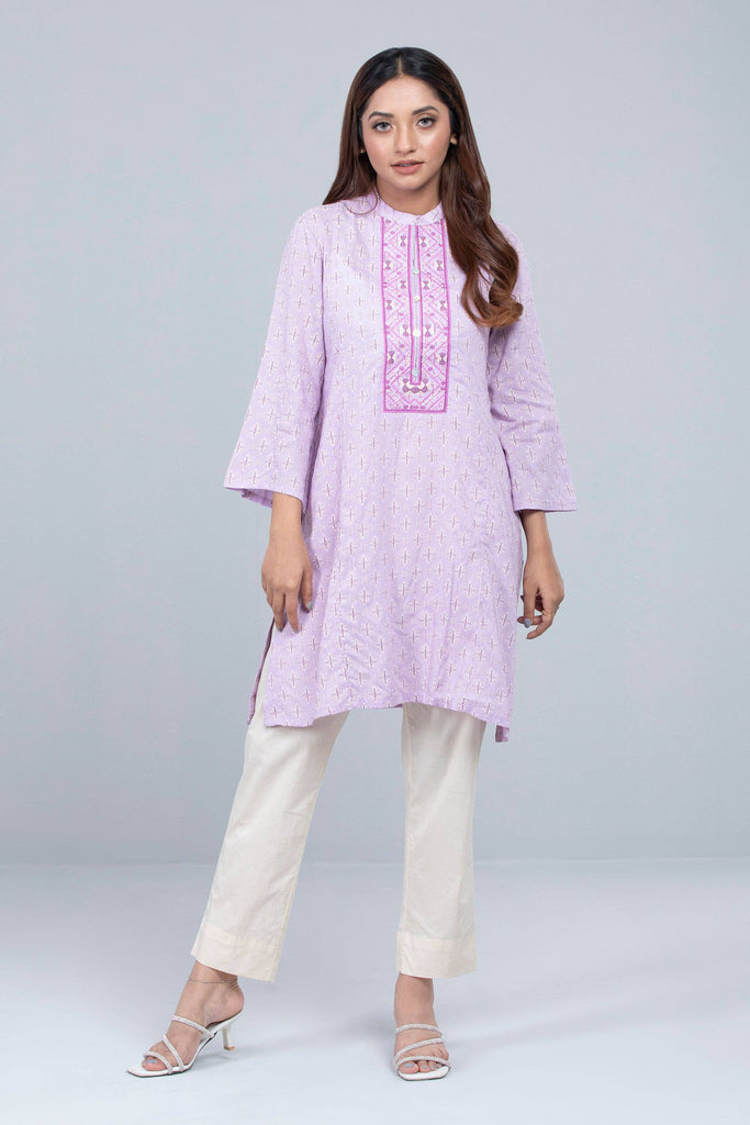 A single piece in viscose with rotary printed. Band collar neck. Added Embroidered and button. 3/4 Loose sleeve.