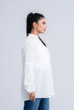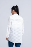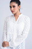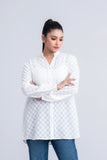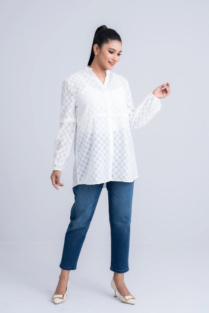 Georgette Mandarin Shirt. A relaxed-fit women's casual shirt made from white Jacquard georgette fabric. It features a Mandarin collar, a front buttoned opening, and full-buttoned cuff sleeves. The shirt has lace details on the front and is designed for a comfortable, hip-covering length.