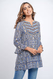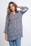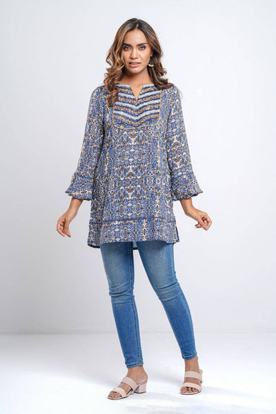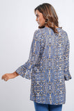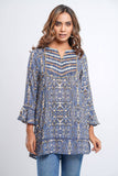 Elevate your style with this 100% viscose tunic, featuring a navy abstract print and intricate embroidery at the neckline with ruffled sleeves adding a touch of elegance to this versatile piece.