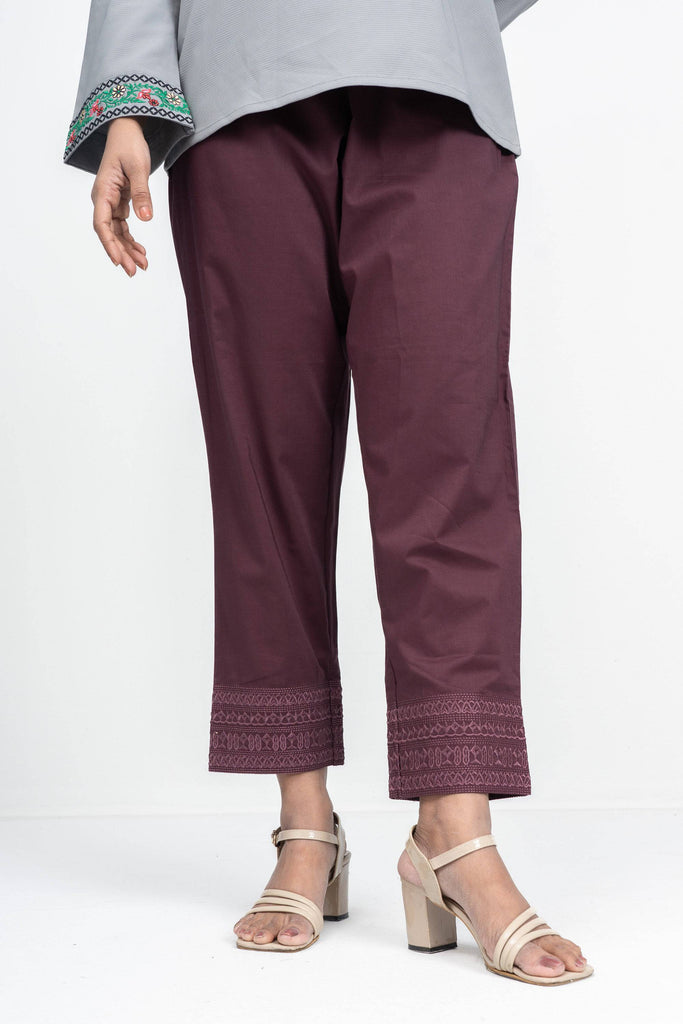 1. A solid color women’s embroidered bottom with embroidery border at hem.