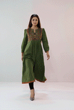 Single piece in viscose with rotary printed. Embroidered with lurex thread, added metallic patch & different sleeve.