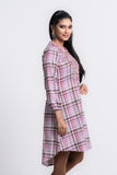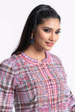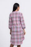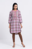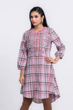 A single piece in stripe fabric. Embroidered, band collar with frill.3/4 sleeve, added gather at the sleeve.