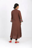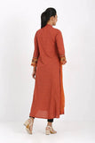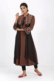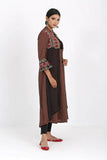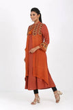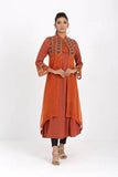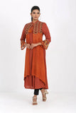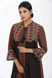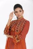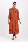 Double-layered style, muslin fabric with rotary printed viscose. Embroidered with lurex thread, added tassel.