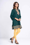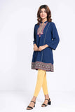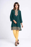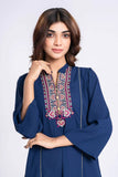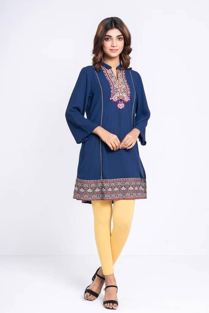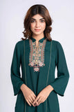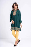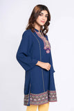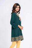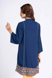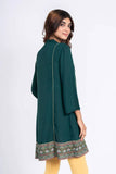 Single piece in viscose. Embroidered with lurex thread, metallic printed at front, 3/4 sleeve with gather, added golden lace piping.