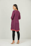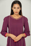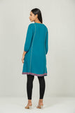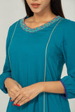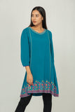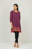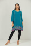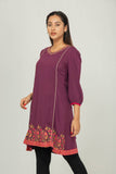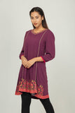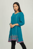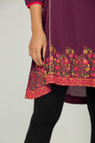 Single piece in viscose. Embroidered with lurex thread, metallic printed at front.3/4 sleeve with gather, added golden lace pipping.