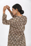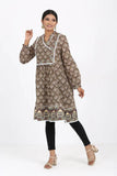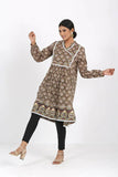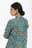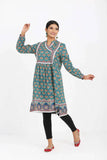 A digital printed kurti embellished with Angrakha style with gather, ptinted patch and sequin lace at neck and front yoke, decorative button at back yoke tab which offers the perfect balance of comfort and style.