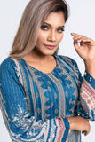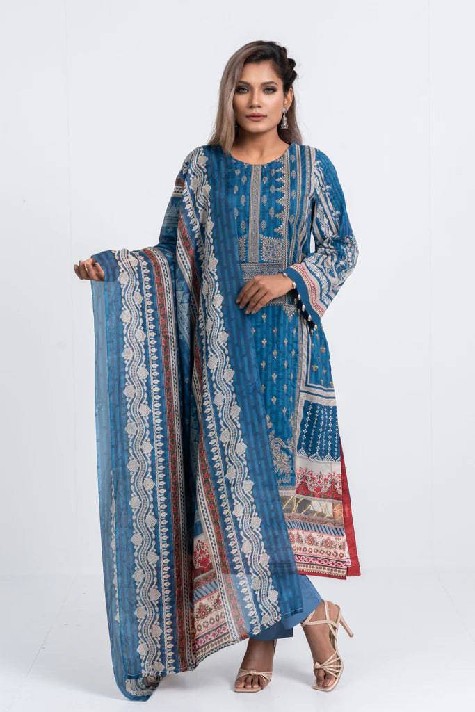 An exclusive digital printed lawn three-piece set embellished with Mughal print, heavy embroidery with sequin, Organza with lurex embroidery, and pearl detailing that exudes elegance and sophistication, perfect for special occasions or adds luxury to your everyday wardrobe. It's come with a silk dupatta and solid-dyed trouser.