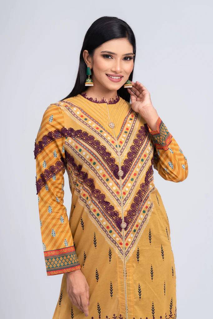 A digital printed kurti embellished with decorative lace, button and pintuck with golden lurex chain stitch which offers the perfect balance of comfort and style.