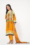 An exclusive digital printed lawn three-piece set embellished with Kilim print, glass work, gold lace detailing that exudes elegance and sophistication,