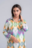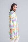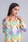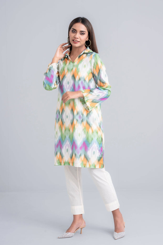 Elevate your style effortlessly with our mid-length printed kurti. Crafted from luxurious lawn fabric and adorned with a wide shirt collar and shell button, it seamlessly combines comfort and chic. Embrace understated elegance for any occasion.