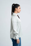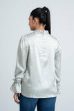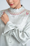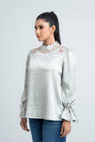 Satin Embroidered Scallop Neck Top Elevate your wardrobe with our Jacquard Polyester Satin fabric top. Boasting full sleeves with tunnel and cord openings, and a scallop-cut high neck, it exudes sophistication. Adorned with floral embroidery on the neck and shoulder, and featuring a back zipper, this classic fitted women's fashion top is a timeless statement piece.