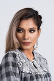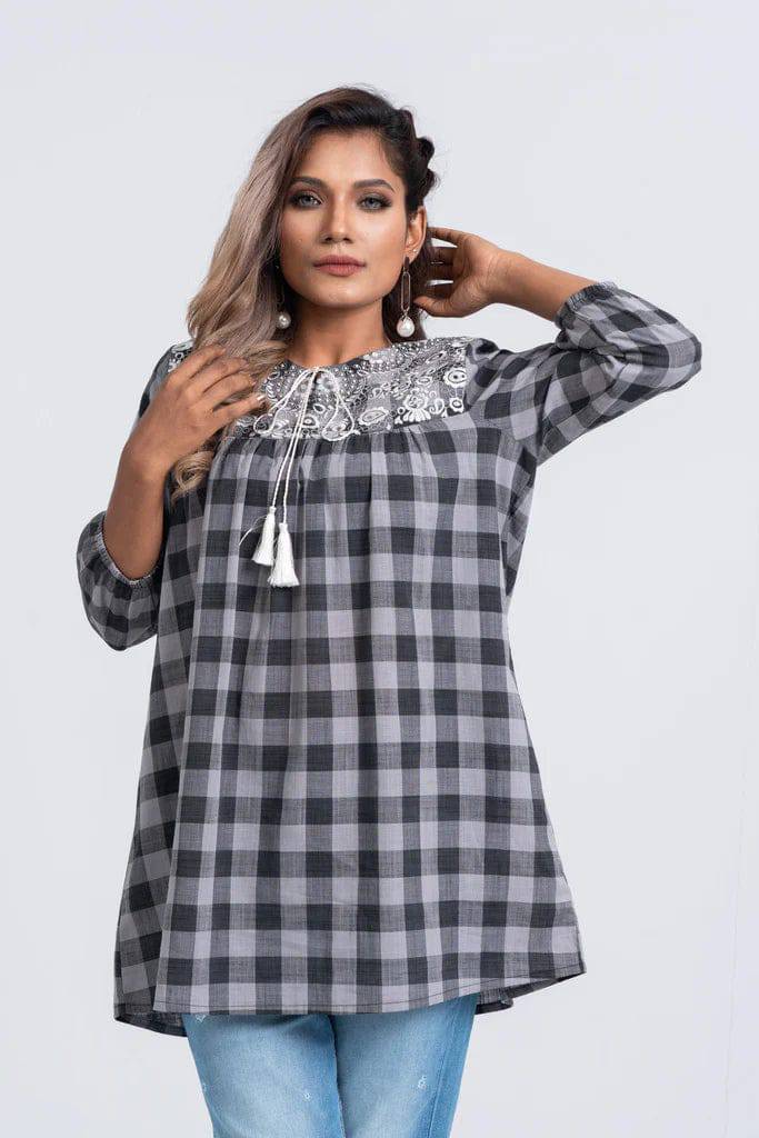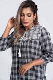 Cotton Check fabric,Floral Embroidery on front & back yoke,Beads Work & tassel,3/4 SleeveLoose fitted Women’s Fashion Top.