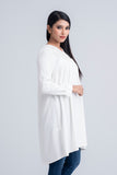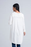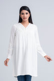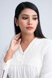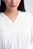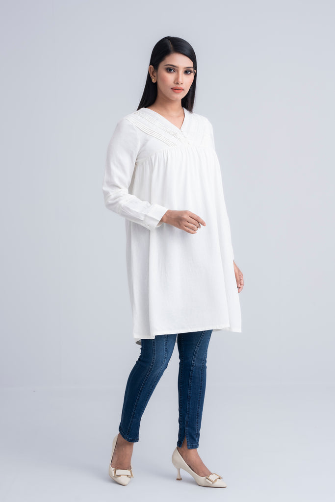 Lace & Pin tuck V-neck Top. Stylish and sophisticated, Our white Jacquard Viscose Fabric top features a flattering V-neckline and a loop buttoned front yoke adorned with delicate pintuck and lace details. The full buttoned cuff sleeves with ladder lace accents add a touch of elegance. With its relaxed fit and hip-covering length, this women's fashion top is effortlessly stylish.